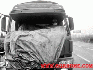 随后,记者与山东高速交警支队济南大队取得了联系,了解了事发过程。12日上午,交警王海波沿着青银高速由西向东例行巡逻。当他9点多驾车巡逻至小许家立交桥路段时,发现一辆红色大货车停在加宽车道上。按照规定,此处是不允许停车的,于是,王海波驾车上前询问。等他驾车来到车头处,才发现这辆货车的奇特之处:淅淅沥沥的小雨中,前挡风玻璃已经完全没了,代之以一块遮盖货物常见的篷布,驾驶员头戴一个黄色安全头盔,正准备起步上路。
